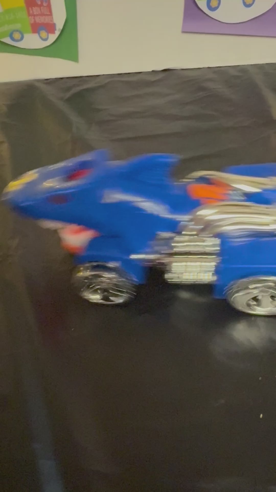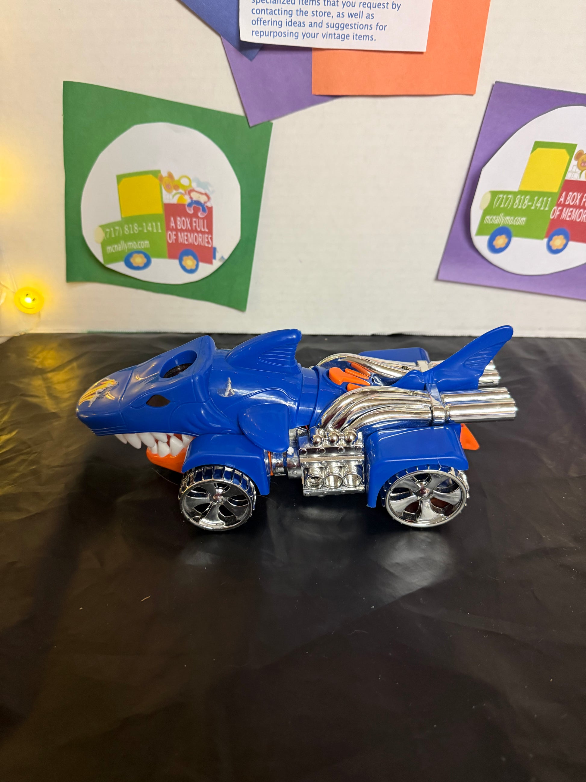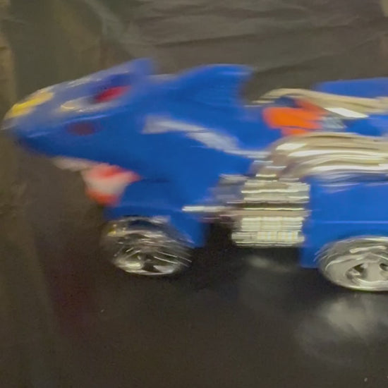 FEATURES MOVEMENT, LIGHTS AND SOUND. As the car moves forward, the front part of the body rocks back-and-forth. The toy operates using three AAA batteries (not included.) 9' X 4" X 4 1/2" Some decals are missing. See pictures.
