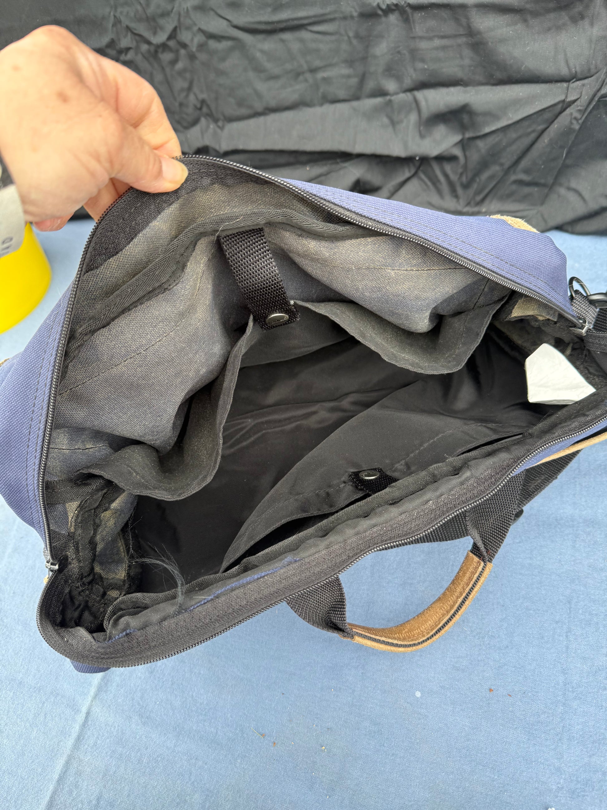 BLUE, BLACK, TAN EXTERIOR BACK POCKET WTHE SNAP, FRONT POCKET WITH ZIPPER AND SRAPS, ZIPPERED INTERIOR WITH 3 POCKETS (2 WITH SNAPS), HAND GRASP AND ADJUSTABLE, REMOVABLE SHOULDER STRAP