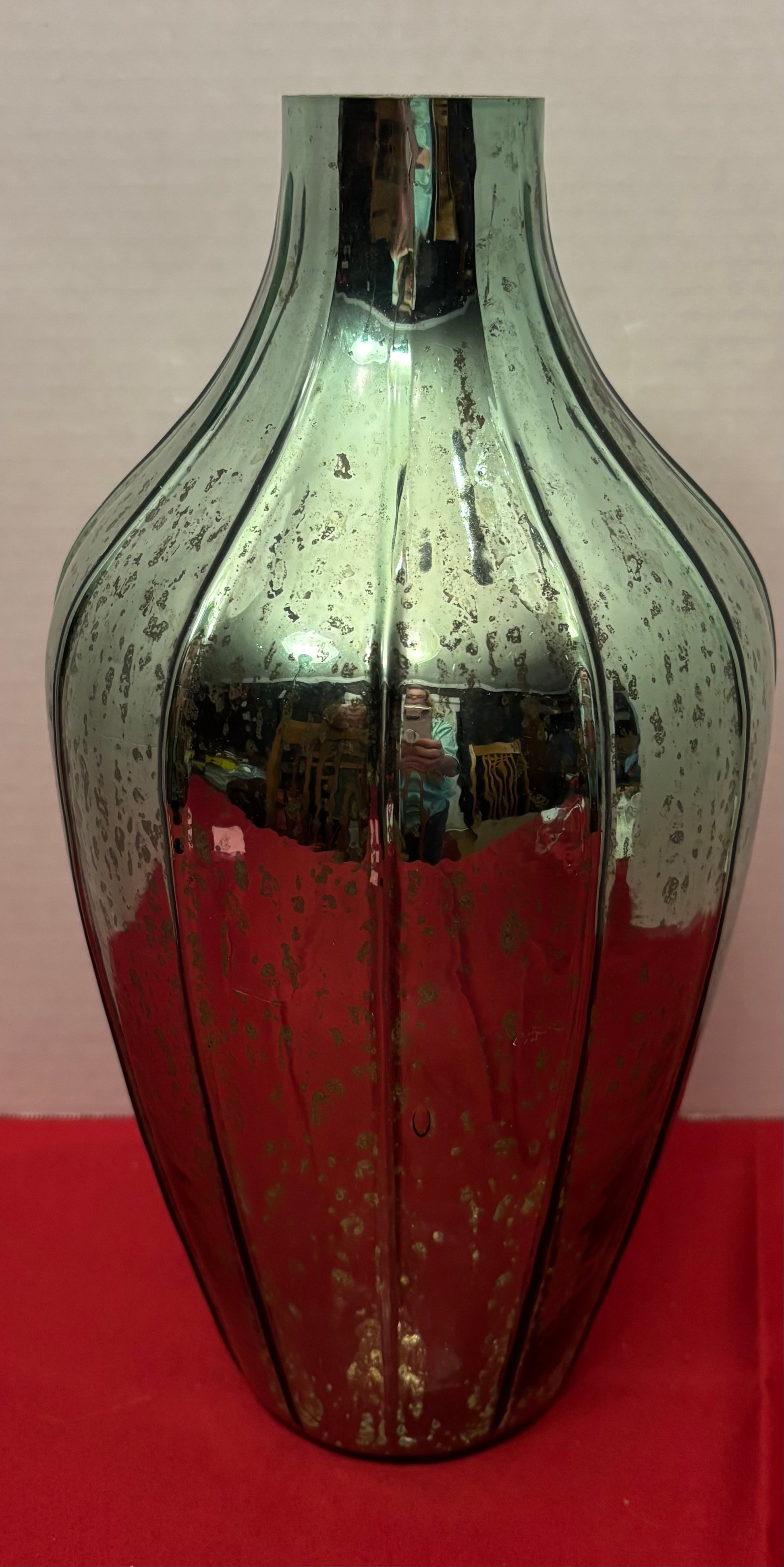 Glass vase. The color is metallic green. It is 12 inches tall. The condition is good.