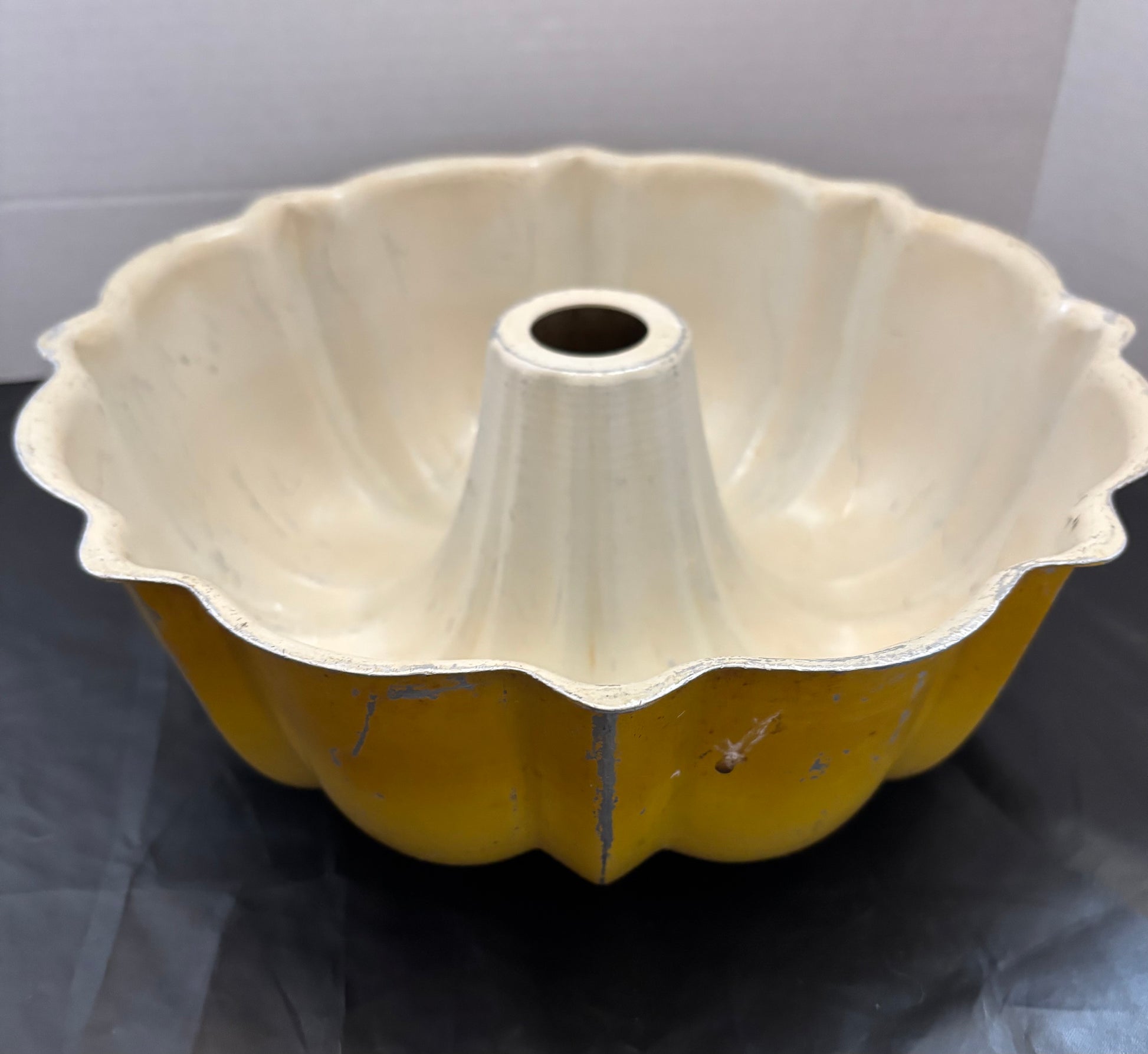 10.5-inch bunt pan. The outside of the pan is harvest gold, and the inside is off-white. Due to scratches on the inside and outside of the pan, the condition is listed as fair.
