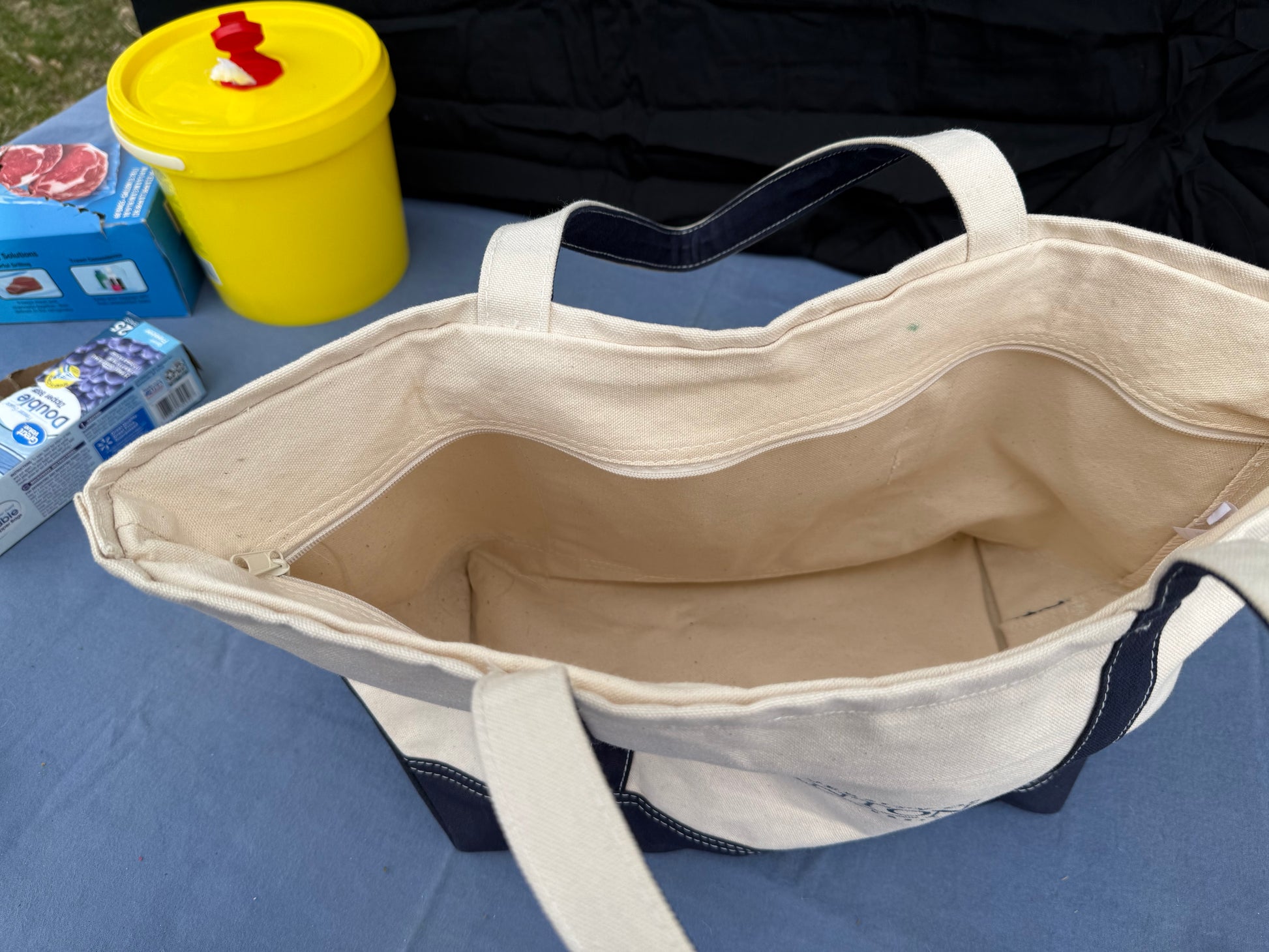 White canvass with blue bottom, handles, lettering University of Scranton A Jesuit University (and picture of building on one side.) zipper