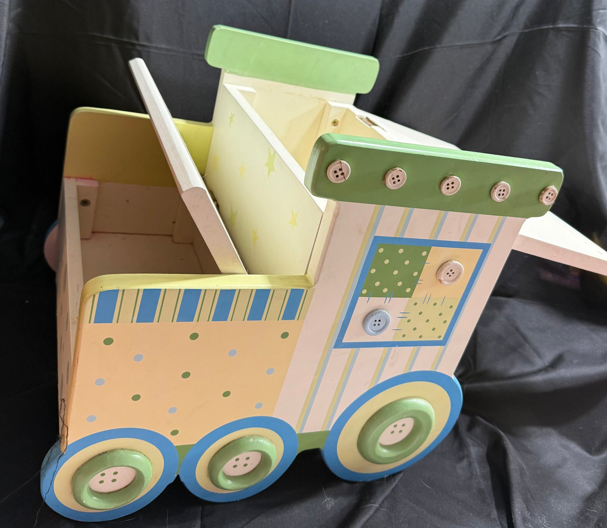 Vintage train footstool with 2 steps. The top of each step is hinged to allow for storage. It is off-white with light green, yellow, and blue stars, polka dots, and stripes. The wheels are made to look like buttons. It is very sturdy. Some wear in the wheels.