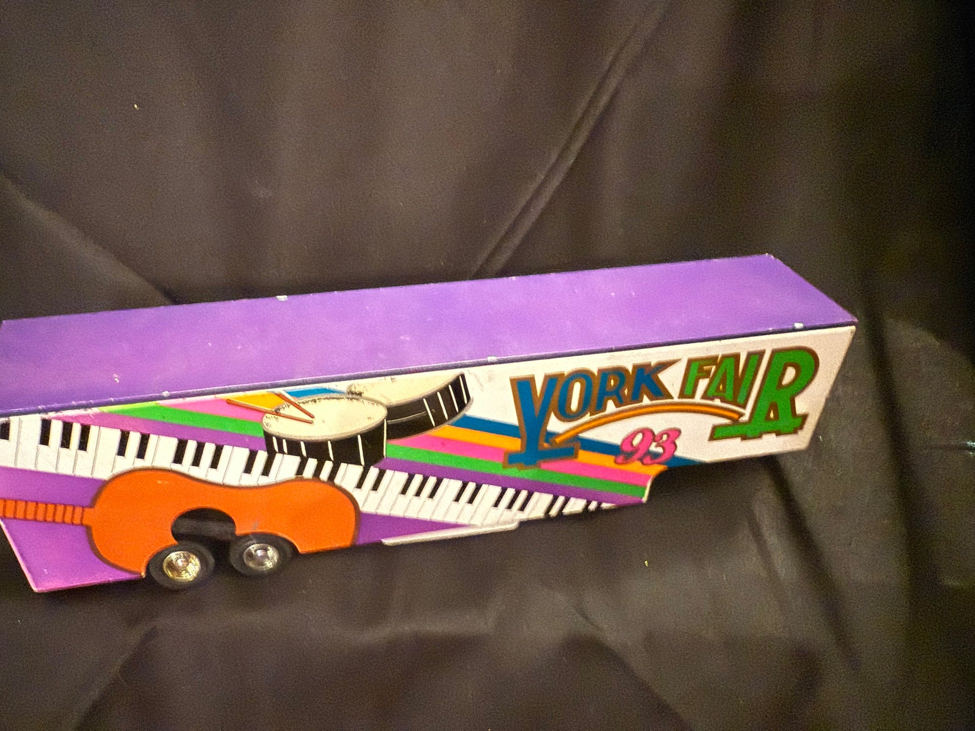 IT IS WHITE WITH A KEYBOARD, GUITAR, 2 DRUMS AND LETTERING "YORK FAIR 93" ON BOTH SIDES. THE CONDITION IS FAIR AS REAR STICKER IS DAMAGED BUT IT DOES OPEN. (YORK FAIR AND DATE) 9" X 2 X 3"